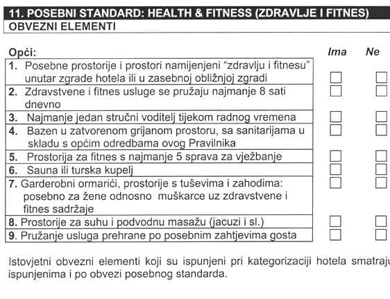 PRILOG XIV ELEMENTI ZA POSEBNE STANDARDE ZA VRSTU: "HOTEL" ![]() ![]() ![]() ![]() ![]() ![]() ![]() ![]() ![]() ![]() ![]() ![]() ![]() ![]() ![]() ![]() Istovjetni obvezni elementi koji su ispunjeni pri kategorizaciji hotela smatraju se ispunjenima i po obvezi posebnog standarda. PRAVILNIK PRILOG I. - ELEMENTI ZA KATEGORIZACIJU HOTELA - POSTOJEĆI OBJEKTI PRILOG II. - ELEMENTI ZA KATEGORIZACIJU HOTELA - NOVI OBJEKTI PRILOG III. - ELEMENTI ZA KATEGORIZACIJU APARTHOTELA - POSTOJEĆI OBJEKTI PRILOG IV. - ELEMENTI ZA KATEGORIZACIJU APARTHOTELA - NOVI OBJEKTI PRILOG V. - ELEMENTI ZA KATEGORIZACIJU TURISTIČKOG NASELJA - POSTOJEĆI OBJEKTI PRILOG VI. - ELEMENTI ZA KATEGORIZACIJU TURISTIČKOG NASELJA - NOVI OBJEKTI PRILOG VII. - ELEMENTI ZA KATEGORIZACIJU TURISTIČKIH APARTMANA - POSTOJEĆI OBJEKTI PRILOG VIII. - ELEMENTI ZA KATEGORIZACIJU TURISTIČKIH APARTMANA - NOVI OBJEKTI PRILOG IX. - ELEMENTI ZA KATEGORIZACIJU PANSIONA - POSTOJEĆI OBJEKTI PRILOG X. - ELEMENTI ZA KATEGORIZACIJU PANSIONA - NOVI OBJEKTI PRILOG XI. - ELEMENTI ZA KATEGORIZACIJU GUEST HOUSE - POSTOJEĆI OBJEKTI PRILOG XII. - GRAFIČKA RJEŠENJA STANDARDIZIRANIH PLOČA ZA OZNAČAVANJE VRSTE I KATEGORIJE SMJEŠTAJNIH OBJEKATA IZ SKUPINE HOTELI PRILOG XIII. - KOMPENZACIJA KRITIČNIH ELEMENATA I ROKOVI ZA ISPUNJENJE ZA OBJEKTE IZ SKUPINE HOTELI – POSTOJEĆI OBJEKTI PRILOG XIV. - ELEMENTI ZA POSEBNE STANDARDE ZA VRSTU: "HOTEL" PRILOG XV. - GRAFIČKA RJEŠENJA STANDARDIZIRANIH PLOČA ZA POSEBNE STANDARDE ZA VRSTU HOTEL Narodne novine 48/02 IZMJENE I DOPUNE PRAVILNIKA, NN 132/03
